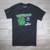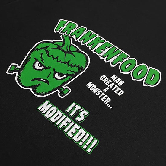 The chilling tale of a monster science created that terrorized our world... and our stomachs!!! *lightning strikes* White and green ink on black tee.